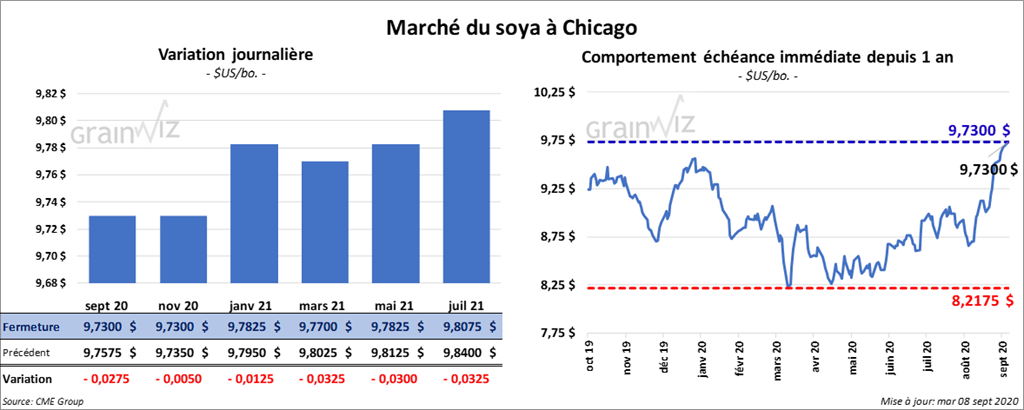 - Dans le cas du rapport d’offre et de demande de septembre, qui sera rendu public vendredi, le marché anticipe un rendement moyen de soya US à 51,8 bpa, avec une réduction de la production de 133,2 millions de boisseaux à 4,292 milliards de boisseaux. Par ailleurs, les analystes s’attendent aussi à des stocks de soya US 2020/2021 à 464 millions de boisseaux.