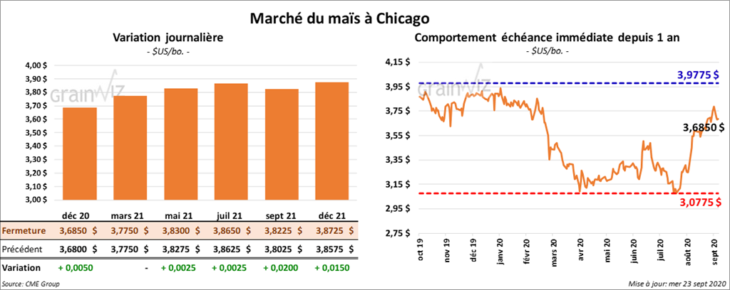 À la fermeture du marché, les contrats de maïs US aux échéances les plus rapprochées étaient en baisse de ½ à 1 ¾ cents.
