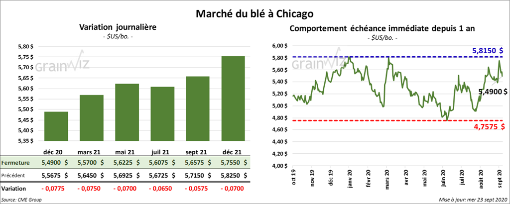 Les contrats de blé US aux échéances les plus rapprochées ont fini la journée dans le rouge. Ceux de blé dur rouge de printemps US aux échéances les plus rapprochées ont clôturé avec des pertes entre 3 ¾ et 6 ¾ cents. Les contrats de blé dur rouge d’hiver US ont terminé la session en baisse de 7 à 7 ¾ cents. À Chicago, les contrats de blé ont fini la séance en recul de 7 ¼ à 9 cents.