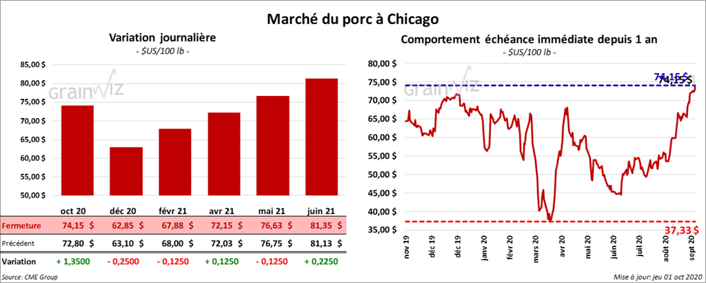 - Le 29 septembre dernier, le CME Lean Hog Index était en hausse de 63 cents à 76,54 $.