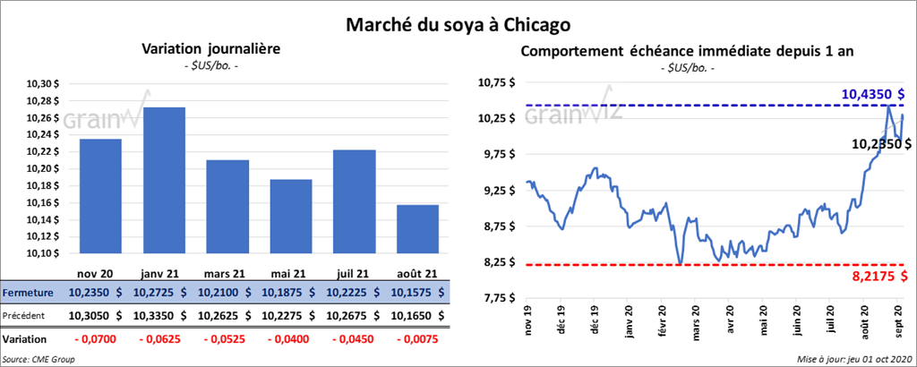 Les contrats différés de soya US ont fini la session sur une note partagée, mais les trois premiers contrats ont terminé la journée au même point qu’en début de séance. Les contrats de tourteau de soya US aux échéances les plus rapprochées ont clôturé en hausse entre 4,80 $ et 5,30 $/tonne. Ceux d’huile de soya US ont fait l’inverse en terminant en baisse de 70 à 72 cents.