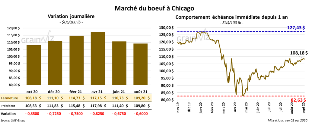 - Le 1er octobre dernier, le CME Feeder Cattle Index était en hausse de 58 cents à 142,96 $.