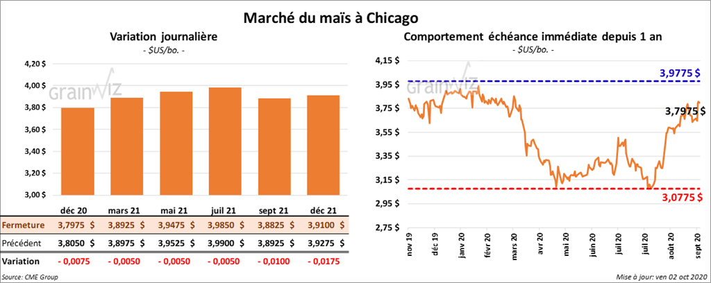 Les contrats de maïs US ont fini la session dans le rouge. Celui décembre 20 a fermé en baisse de 3 cents.