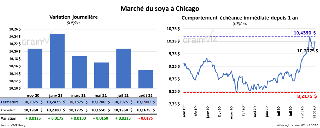 - Le Brésil a rapporté que les expéditions de soya brésilien ont été de 4,47 millions de tonnes au cours du mois de septembre dernier, ce qui correspondait à une baisse comparativement aux 4,6 millions de tonnes de septembre 2019.
