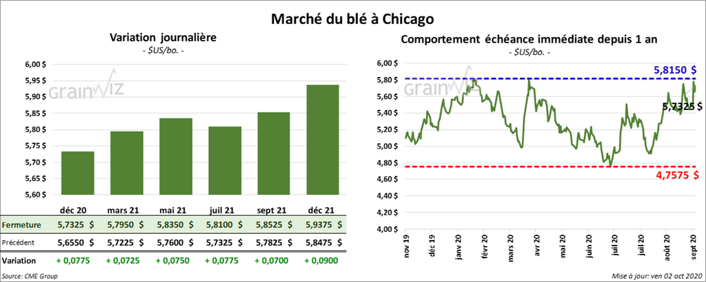 Les contrats de blé d’hiver US ont terminé la séance dans le vert, mais ceux de blé de printemps ont clôturé en baisse. Les contrats de blé tendre rouge d’hiver US ont fermé avec des gains entre 3 et 4 cents. Ceux de blé dur rouge d’hiver US ont suivi en finissant en hausse de 3 à 3 ½ cents. Les contrats de blé dur rouge de printemps ont clôturé avec des pertes entre 1 ¾ à 2 cents.