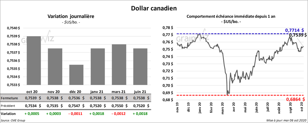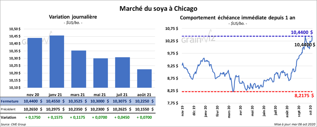 Les contrats de soya US ont terminé la journée en hausse par 2 chiffres. Ceux de tourteaux de soya US ont clôturé avec des gains entre 2,14 % à 3,11 %. Les contrats d’huile de soya US ont également fini en progression de 48 à 53 points.