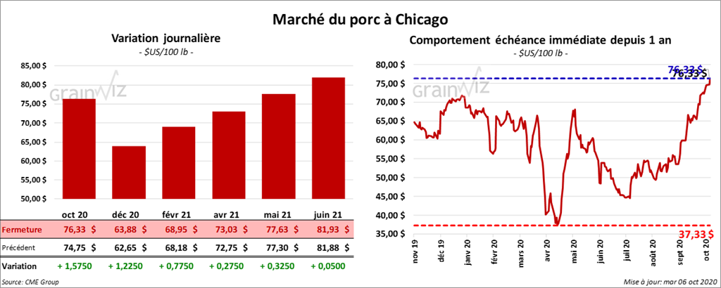 - Le 2 octobre dernier, le CME Lean Hog Index était en hausse de 45 cents à 77,26 $.