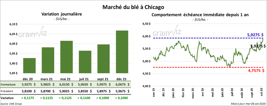 - Le rapport d’offre et de demande d’octobre sera rendu public vendredi. Les analystes s’attendent en moyenne à une réduction des stocks mondiaux de blé de 2,2 millions de tonnes. Pour les États-Unis, ils projettent des inventaires de fin d’année entre 830 et 917 millions de boisseaux.