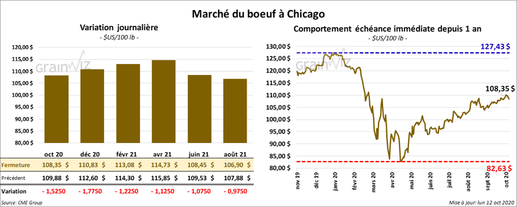 - Le 9 octobre dernier, le CME Feeder Cattle Index était en baisse de 54 cents à 141,28 $.