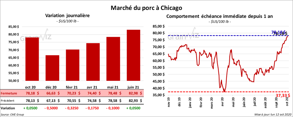 - Le 8 octobre dernier, le CME Lean Hog Index était en hausse de 9 cents à 77,71 $.