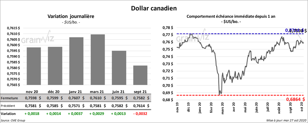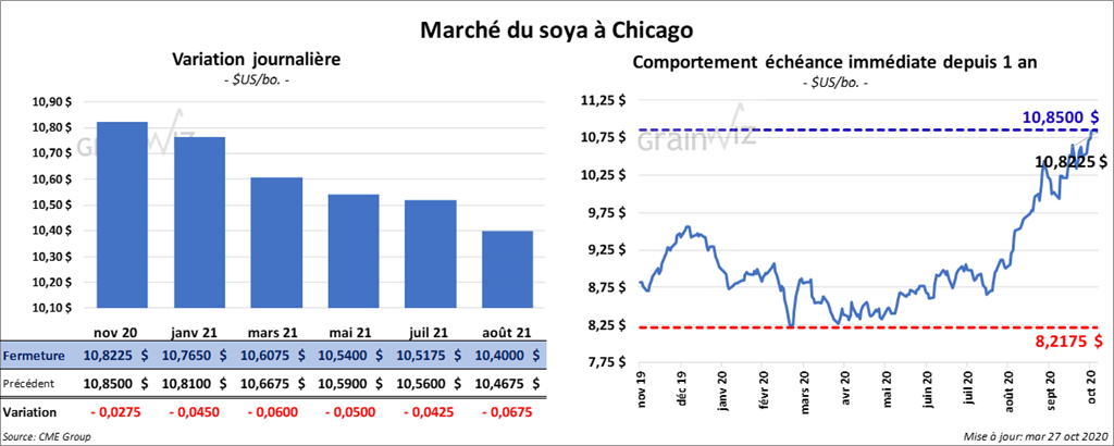 Les contrats de soya US ont fini la session en baisse de 5 ½ à 8 ¼ cents. Sous l’effet des prises de profits, ceux de tourteau de soya US aux échéances les plus rapprochées ont clôturé dans le rouge par 5,60 $/tonne. Les contrats d’huile de soya ont terminé la journée en recul de 29 à 35 points.