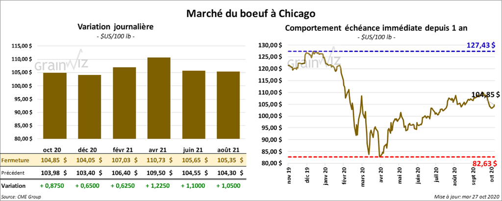 Les contrats de bœuf US aux échéances les plus rapprochées ont fini la journée en hausse de 62 cents à 1,25 $. Ceux de veau US ont également terminé dans le vert entre 1,60 $ et 1,72 $.