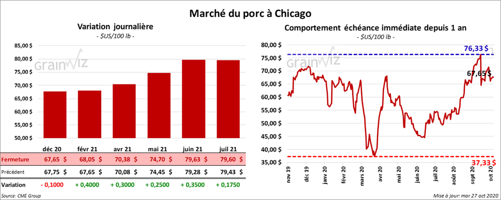 - Le 23 octobre dernier, le CME Lean Hog Index était en baisse de 37 cents à 78,17 $.
