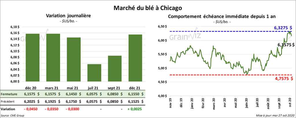 À la fermeture à Chicago, les contrats de blé étaient en baisse de 2 ½ à 4 ½ cents. Ceux de blé dur rouge d’hiver ont terminé en recul de 2 ¾ à 3 ¼ cents. Les contrats de blé de printemps ont suivi la même direction en finissant dans le rouge de ¾ à 3 ½ cents.