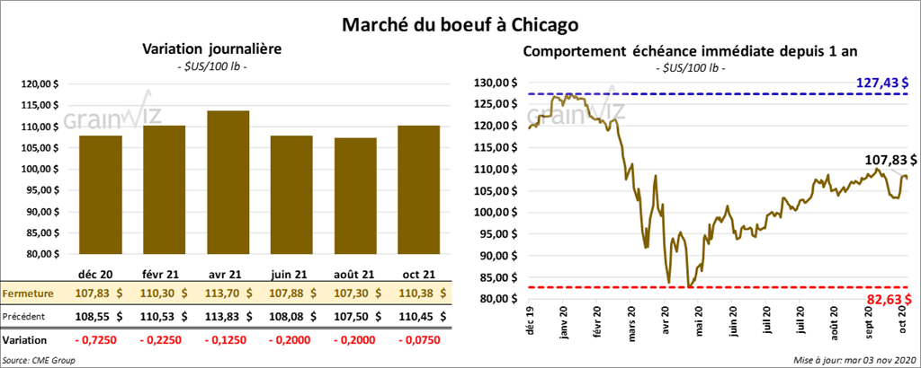Les contrats de porc US aux échéances les plus rapprochées ont terminé la journée avec des gains entre 20 et 50 cents. Celui décembre 20 a fait exception en finissant en baisse de 55 cents.