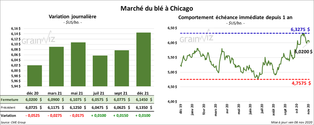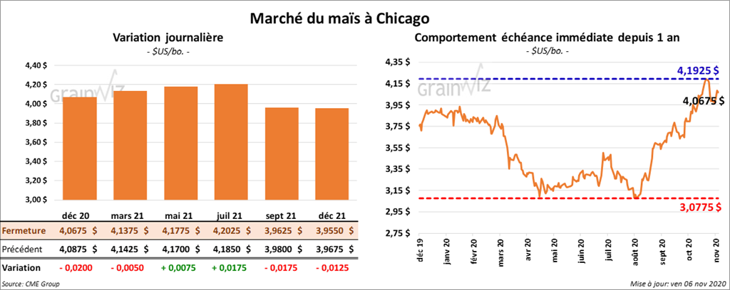 Le contrat de maïs US décembre 20 a terminé la session en baisse de 2 ½ cents, mais les contrats échéant en 2021 ont fini la journée avec des gains.