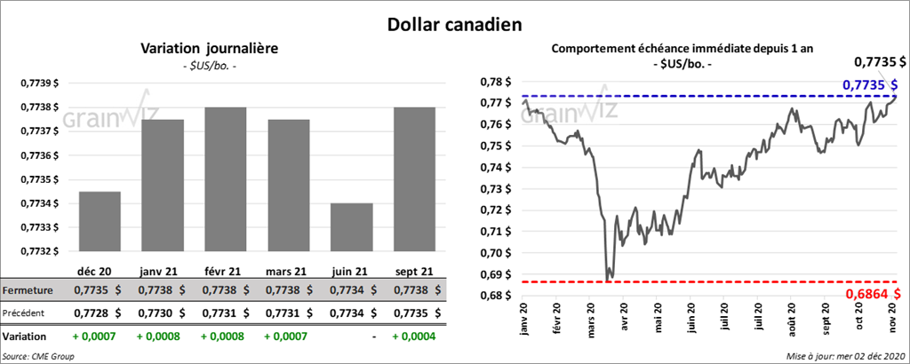 Les contrats de soya US aux échéances les plus rapprochées ont fini en recul de 3 ¼ à 4 ¾ cents. Le contrat de tourteau de soya US janvier 21 a clôturé dans le rouge de 3,10 $/tonne. Ceux d’huile de soya US ont également terminé en baisse de 9 points.