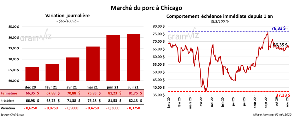 - Le 30 novembre dernier, le CME Lean Ho Index était en baisse de 14 cents à 66,67 $.