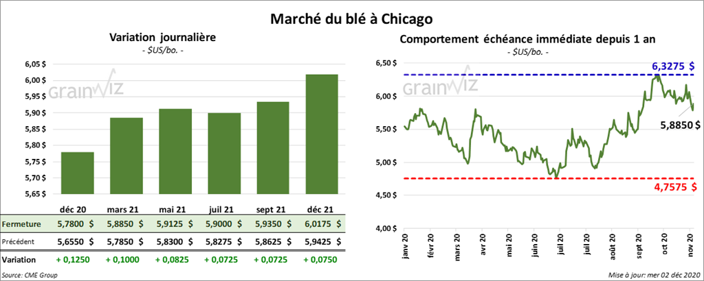 À Chicago, les contrats de blé aux échéances les plus rapprochées ont terminé la journée en hausse entre de 7 ¼ cents à 1 $. À Kansas, les contrats de blé dur rouge aux échéances les plus rapprochées ont clôturé en progression entre 13 cents et 14 ¾ cents. À Minneapolis, ceux de blé de printemps aux échéances les plus rapprochées ont fermé en hausse de 4 ¾ à 6 ¾ cents.