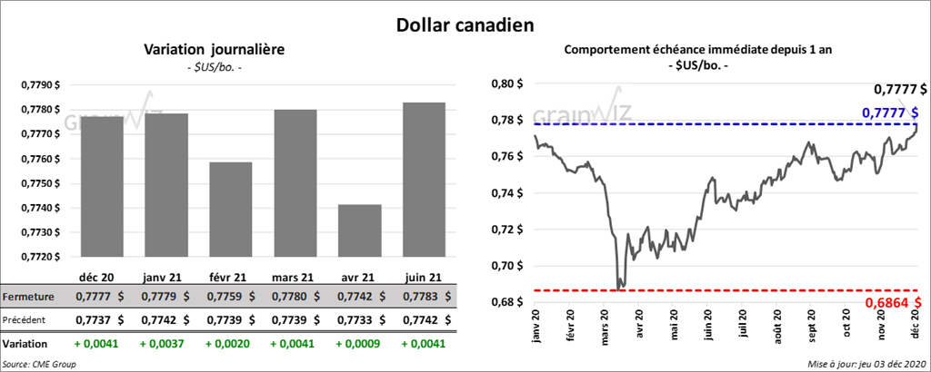 - Dans son rapport sur la production des grandes cultures canadiennes, Statistique Canada mentionne que la production de blé canadien a augmenté de 7,7 % à 35,2 millions de tonnes en 2020. La production s’est accrue dans les Prairies. Les rendements et les superficies récoltées ont tous deux progressé de 3,8 %. Les rendements ont été évalués à 52,2 bo./acre et les superficies de 24,8 millions d’acres. Les marchés estiment que ce rapport est positif.