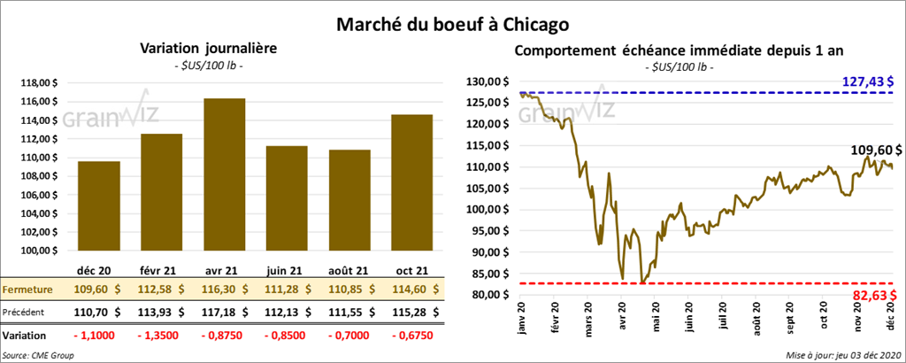 - Le 2 décembre dernier, le CME Feeder Cattle Index était en baisse de 43 cents à 139,44 $.