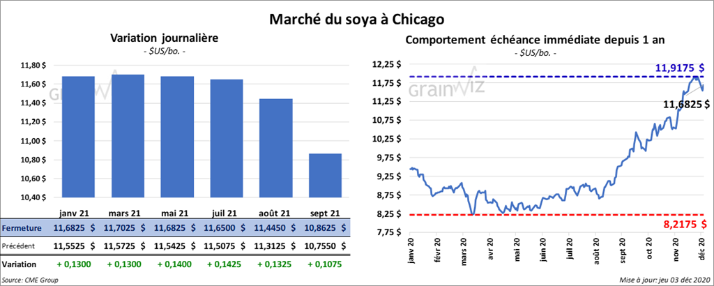 Les contrats de soya US aux échéances les plus rapprochées ont fini la session en hausse de 13 cents à 14 ¼ cents. Ceux de tourteau de soya ont terminé la journée en progression de 3,30 $ à 4,40 $/tonne. Les contrats d’huile de soya US ont clôturé dans le vert de 2 % à 3,2 %.