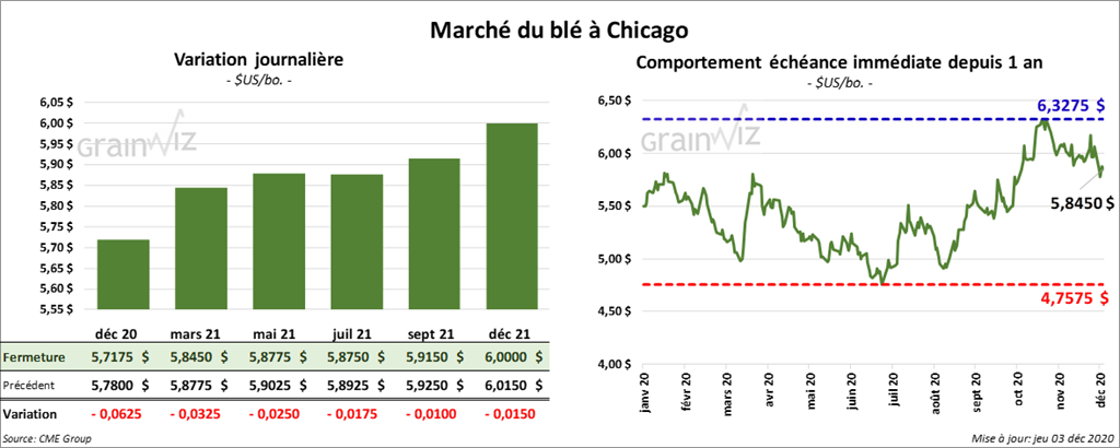 À Chicago, les contrats de blé aux échéances les plus rapprochées ont clôturé en baisse de 1 cent à 3 ¼ cents. À Kansas, les contrats de blé dur rouge aux échéances les plus rapprochées ont également fini en recul de 3 ½ à 4 cents. À Minneapolis, ceux de blé de printemps aux échéances les plus rapprochées ont fermé dans le rouge entre 2 et 2 ½ cents.