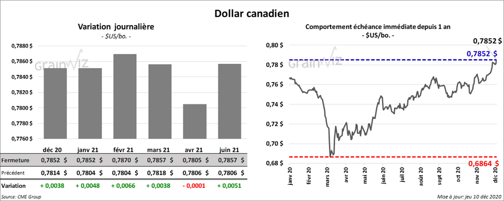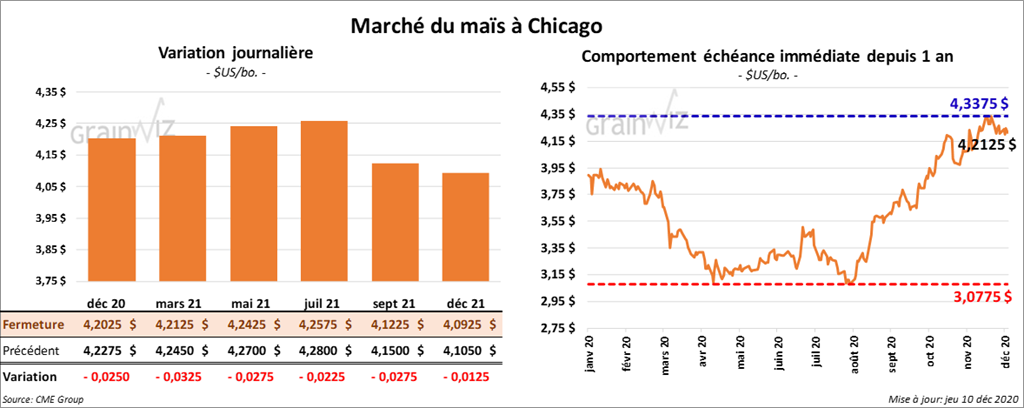 - Vers midi, l’USDA présentait son rapport d’offres et de demande pour le mois de décembre. Il a laissé inchangé sa projection du rendement de maïs US 2020/21 à 175,8 bpa. Sa prévision de la production du maïs US 2020/21 a aussi été maintenue à 1,995 milliard de boisseaux. L’estimation des stocks de fin d’année de maïs US 2020/21 est demeurée inchangée à 1,702 milliard de boisseaux. Toujours selon l’USDA, mondialement, les stocks de fin d’année de maïs 2020/21 ont baissé de 0,8 % comparativement à novembre à 288,96 millions de tonnes. Cette situation s’explique par les réductions des productions argentines, européennes et canadiennes. L’USDA a aussi mentionné qu’il prévoit une augmentation des importations chinoises de maïs de 27 % à 16,5 millions de tonnes. Par ailleurs, il a soutenu qu’il estime qu’il y a une augmentation de la production de maïs ukrainien de 1 million de tonnes à 29,5 millions de tonnes. De manière générale, le marché considère que les données du rapport du WASDE de décembre sont pratiquement inchangées par rapport à celles du mois de novembre dernier.