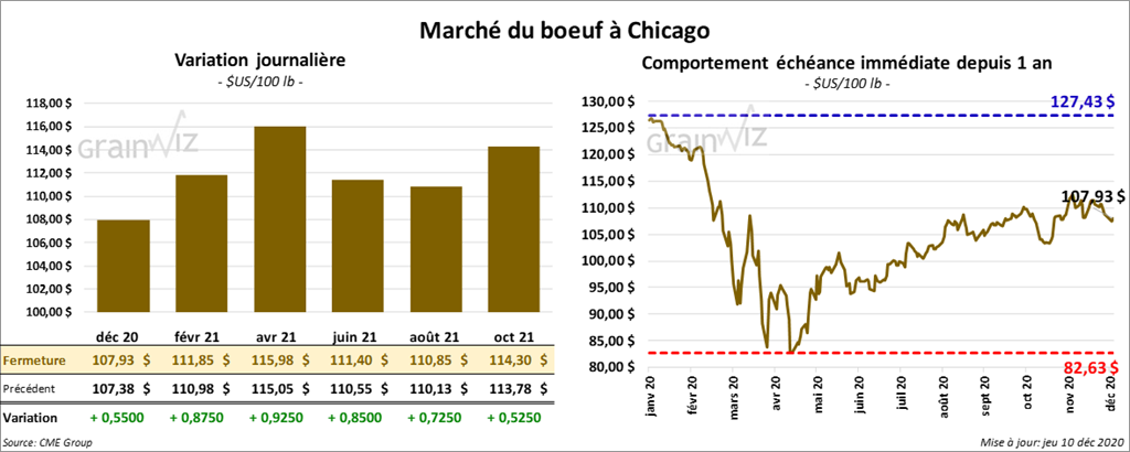 - Dans son rapport du WASDE de décembre, l’USDA estime qu’il y a une augmentation de la production de bœuf US de 15 millions de lb pour 2020. Il prévoit une réduction de 105 millions de lb pour 2021. Pour 2020, il estime donc la production à 27,238 millions de lb. Dans le cas de 2021, il l’anticipe à 27,620 millions de lb.