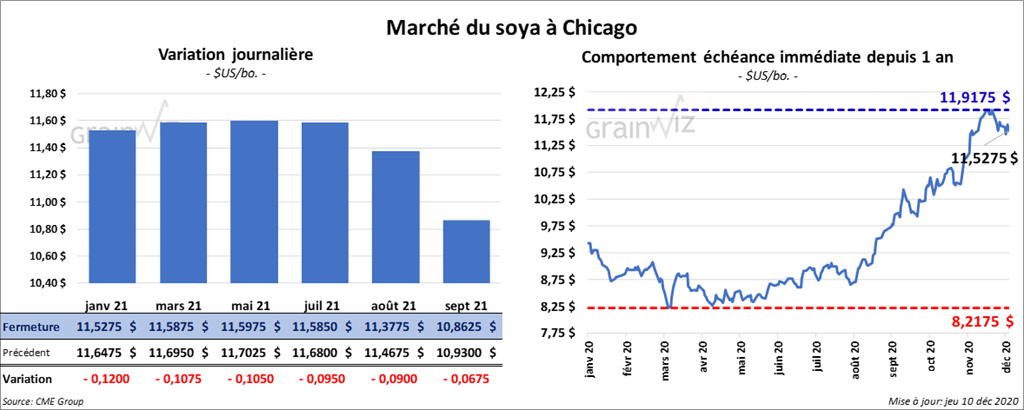 - Concernant le rapport d’offre et de demande (WASDE), tout comme avec le maïs, l’USDA a laissé inchangée son anticipation des rendements de soya US 2020/21 par rapport à novembre dernier à 50,70 bpa. Il a également maintenu sa projection de la production de soya US 2020/21 comparativement au mois précédent à 4,170 milliards de boisseaux. Toutefois, l’USDA estime que les stocks de fin d’année de soya US 2020/21 ont baissé de 7,9 % par rapport à novembre dernier à 175 millions de boisseaux. Mondialement, les inventaires de fin d’année de soya 2020/21 ont baissé de 1,0 % à 85,64 millions de tonnes. Il y a eu de légères réductions des stocks argentins et UE. Toutefois, l’estimation de la production de soya brésilien est maintenue à 133,0 millions de tonnes. De façon générale, les analystes estiment qu’il y a peu de changements dans le rapport d’offre et de demande de décembre.