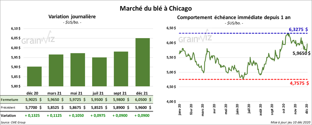 À Chicago, les contrats de blé aux échéances les plus rapprochées ont fermé en hausse de 9 ¾ à 11 ¼ cents. À Kansas, ceux de blé dur rouge aux échéances les plus rapprochées ont aussi clôturé avec des gains entre 12 et 12 ½ cents. À Minneapolis, les contrats de blé de printemps ont terminé la journée dans le vert entre 7 et 7 ½ cents.