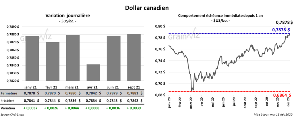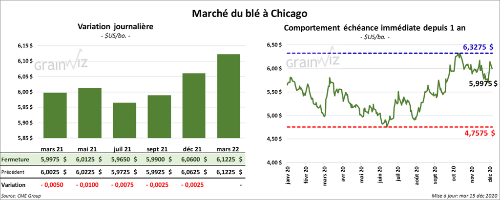 À Chicago, les contrats de blé aux échéances les plus rapprochées ont terminé la session avec des pertes entre ¼ et 10 cents. À Kansas, les contrats de blé dur rouge aux échéances les plus rapprochées ont fait l’inverse en clôturant en hausse de 2 ¾ à 3 ¾ cents. À Minneapolis, ceux de blé de printemps aux échéances les plus rapprochées ont aussi fini en progression de 1 ¼ à 2 cents.