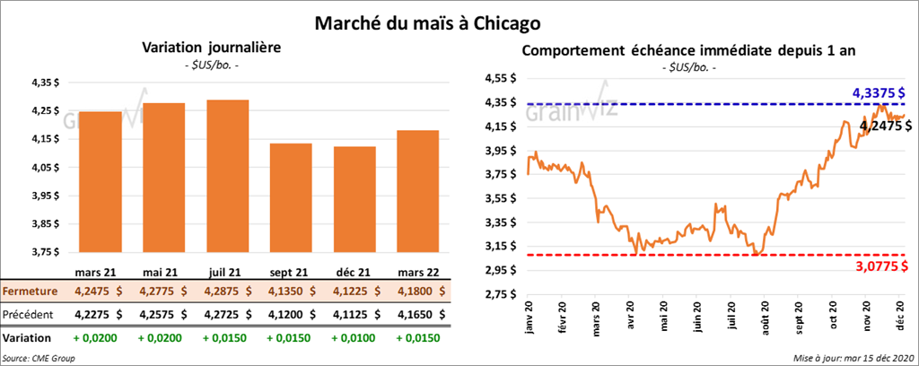 Les contrats de maïs US aux échéances les plus rapprochées ont terminé la journée dans le vert entre 1 ½ et 2 cents.