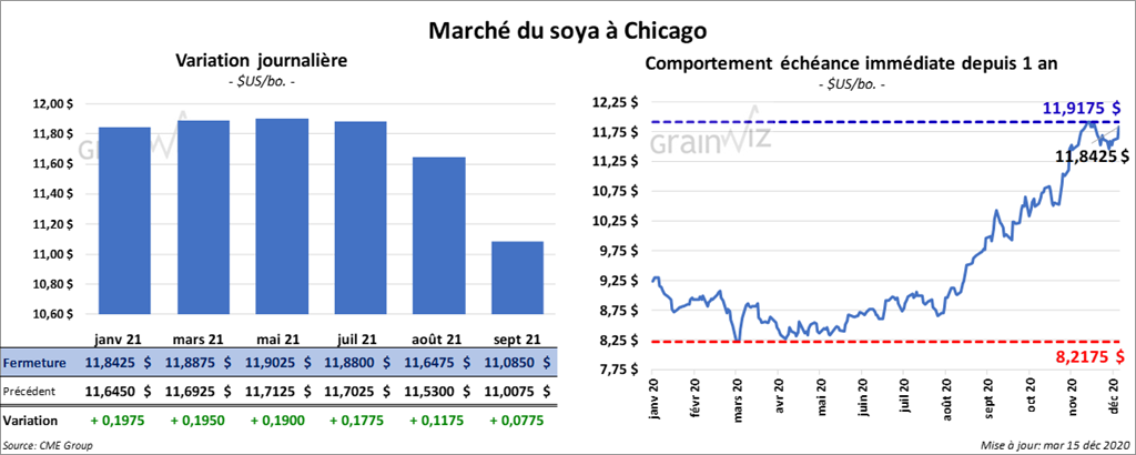Les contrats de soya US aux échéances les plus rapprochées ont fini la journée avec des gains entre 17 ¾ et 19 ¾ cents. Ceux de tourteau de soya US aux échéances les plus rapprochées ont fermé en hausse de 4,30 $ à 7,50 $/tonne. Les contrats d’huile de soya US aux échéances les plus rapprochées ont également terminé en progression entre 39 et 46 points.