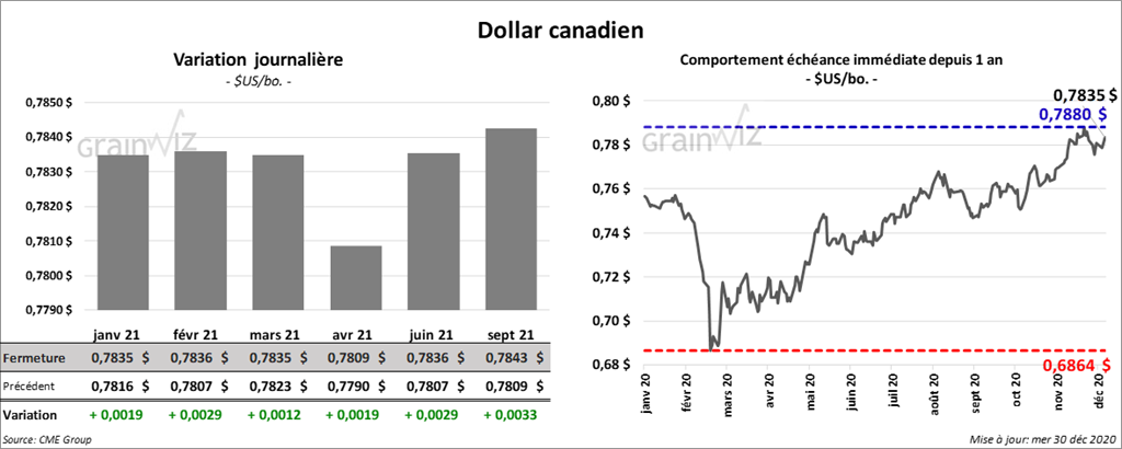 Les contrats de soya US aux échéances les plus rapprochées ont fermé avec des gains entre 4 ¼ et 10 ¼ cents. Ceux de tourteau de soya US aux échéances les plus rapprochées ont terminé la session en hausse entre 1,20 et 5,40 $/tonne. Les contrats d’huile de soya US aux échéances les plus rapprochées ont clôturé dans le vert entre 11 et 19 points.