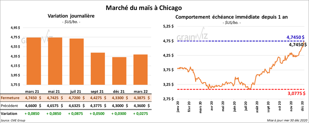 Les contrats de maïs US aux échéances les plus rapprochées ont terminé la journée en hausse entre 5 et 8 ½ cents.
