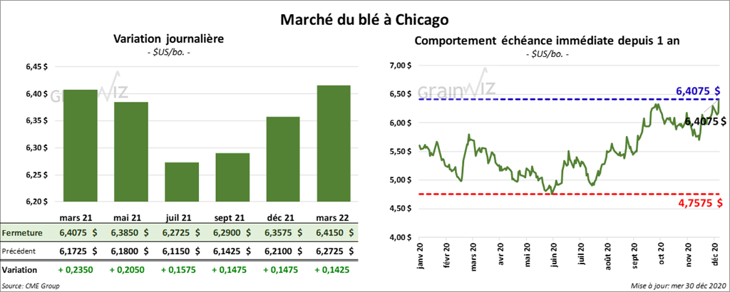 À Chicago, les contrats de blé aux échéances les plus rapprochées ont fini la journée en hausse entre 14 ¾ et 23 ½ cents. À Kansas, ceux de blé dur rouge aux échéances les plus rapprochées ont terminé dans le vert entre 15 ¼ et 16 ½ cents. À Minneapolis, les contrats de blé de printemps aux échéances les plus rapprochées ont clôturé avec des gains entre 11 ¼ et 15 ¾ cents.