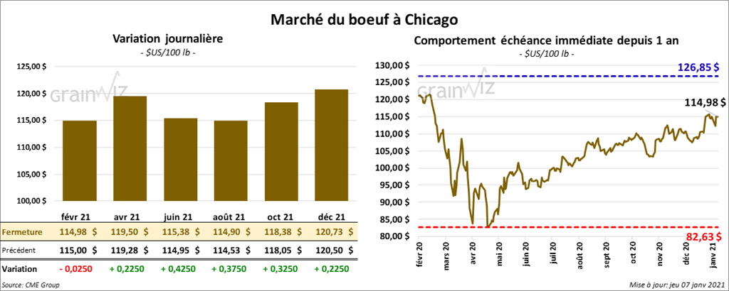 Sauf le contrat février 21 qui a fini en baisse de 2 cents, les contrats de bœuf US aux échéances les plus rapprochées ont terminé la journée en hausse entre 22 et 42 cents. Ceux de veau US aux échéances les plus rapprochées ont également clôturé dans le vert entre 1 $ et 1,10 $.