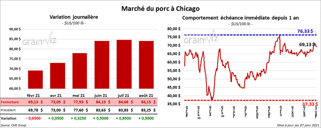 Les contrats de porc US aux échéances les plus rapprochées ont fini dans le vert entre 5 et 85 cents. Celui février 21 a fait exception en terminant en baisse de 65 cents.