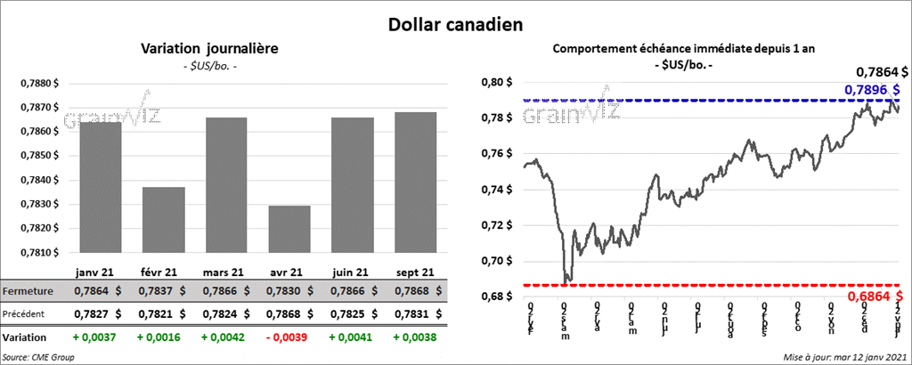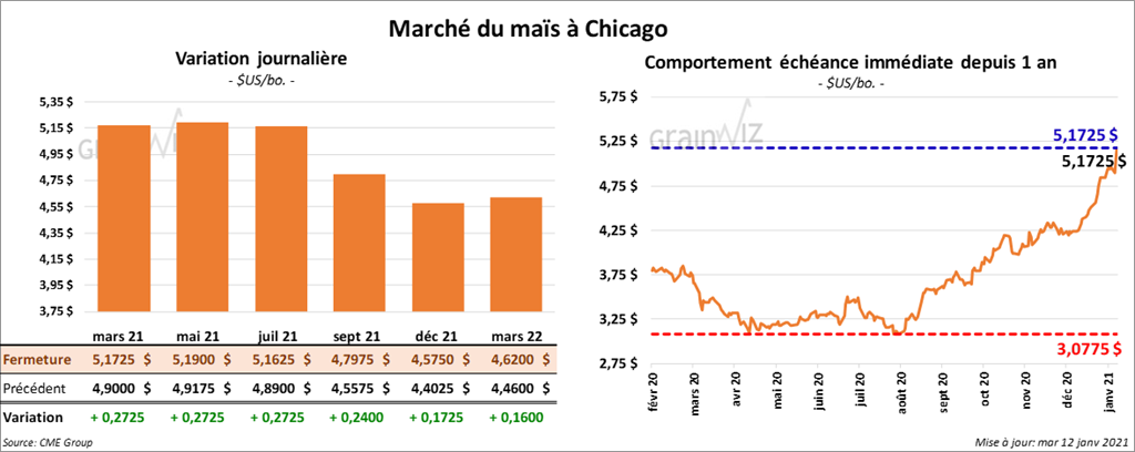 - Concernant le rapport d’offre et de demande, qui a été publié aujourd’hui, l’USDA estime que pour janvier 2021, la production de maïs US 2020/21 est en baisse de 2,2 % comparativement à décembre dernier à 14,182 milliards de boisseaux. La moyenne des anticipations des analystes était de 14,470 milliards de boisseaux. Toujours selon l’USDA, le rendement de maïs US est en baisse de 2,2 % par rapport au mois de décembre 2020 à 172,0 boisseaux par acre. Les analystes s’attendaient en moyenne à 175,3 bpa. Quant à la récolte, elle s’étale sur 82,50 millions d’acres, ce qui est une baisse de 0,03 % par rapport à décembre dernier. Le marché anticipait 82,543 millions d’acres. Au 1er décembre dernier, les inventaires de maïs US 2020-21 étaient en hausse de 468 % par rapport au 1er septembre dernier à 11,322 milliards de boisseaux. Les analystes prévoyaient une moyenne de 11,951 milliards de boisseaux. Par ailleurs, les stocks de fin d’année de maïs US 2020/21 étaient de 1,552 milliard de boisseaux, soit une réduction de 8,8 % comparativement à décembre dernier. Les analystes projetaient un résultat moyen de 1,599 milliard de boisseaux.