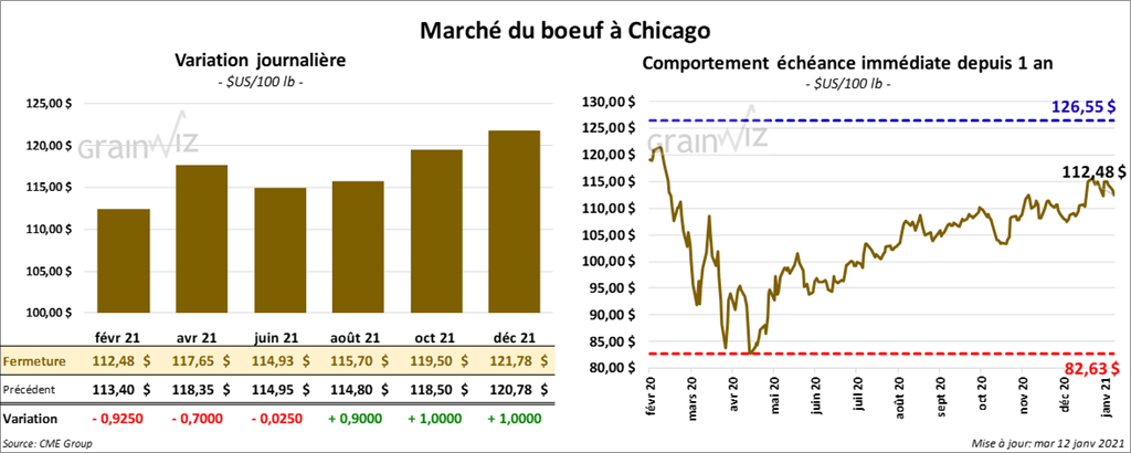 Les contrats de bœuf US aux échéances les plus rapprochées ont terminé la session en baisse entre 2 et 92 cents. Celui août 21 a fait exception en clôturant avec un gain de 90 cents. Pour le veau US, les contrats aux échéances les plus rapprochées ont fini en baisse entre 1,70 $ et 2,92 $.