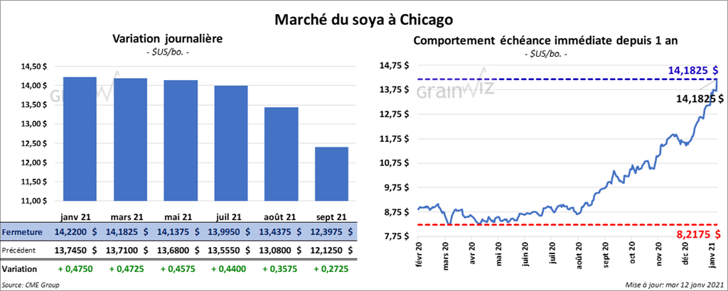 - Concernant le rapport d’offre et de demande, qui a été publié aujourd’hui, l’USDA estime que pour janvier 21, la production de soya US est de 4,135 milliards de boisseaux, soit en réduction de 0,8 % par rapport à décembre dernier. Les analystes s’attendaient, en moyenne, à une production de 4,158 milliards de boisseaux. Le rendement de soya US 2020/21 a été estimé à 50,2 bpa, ce qui représente une baisse de 1 % par rapport à décembre passé. Les analystes anticipaient 50,5 bpa. Par ailleurs, l’USDA mentionne que la récolte s’étale sur 82,30 millions d’acres alors que le marché prévoyait qu’elle l’était sur 82,305 millions d’acres. Il s’agit en réalité d’une hausse de 0,01 % par rapport à décembre dernier. L’USDA soutient par ailleurs qu’en date du 1er décembre dernier, les inventaires de soya US étaient de 2,933 milliards de boisseaux alors que les attentes du marché étaient de 2,920 milliards de boisseaux. C’était en fait une hausse de 461 % par rapport au 1er septembre dernier. Quant aux stocks de fin d’année de soya US, ils ont été évalués à 0,140 milliard de boisseaux, soit en baisse de 0,2 % comparativement à décembre 2020.
