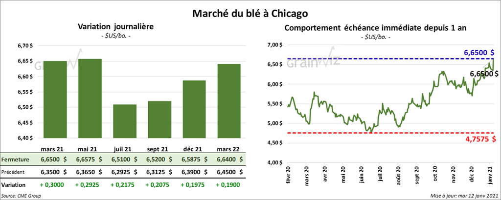 À Chicago, les contrats de blé aux échéances les plus rapprochées ont terminé la séance en hausse entre 20 ¾ et 30 cents. À Kansas, les contrats de blé dur rouge aux échéances les plus rapprochées ont fini la session dans le vert entre 25 ¼ et 28 ½ cents. À Minneapolis, les contrats de blé de printemps aux échéances les plus rapprochées ont clôturé avec des gains entre 14 ½ et 15 ¼ cents.