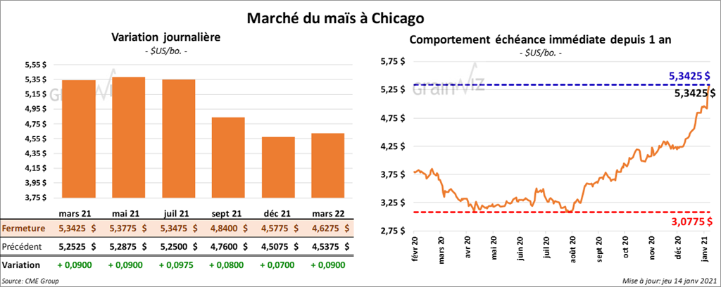 - Durant la semaine du 7 janvier dernier, les ventes nettes à l’exportation de maïs US 2020/21 ont été de 1,437,700 tonnes, ce qui était une hausse de 92 % par rapport à la semaine précédente et une augmentation de 34 % comparativement à la moyenne des 4 dernières semaines. Le Japon et les destinations inconnues ont été les plus gros acheteurs. Les anticipations du marché étaient entre 700,000 et 1,2 millions de tonnes.
