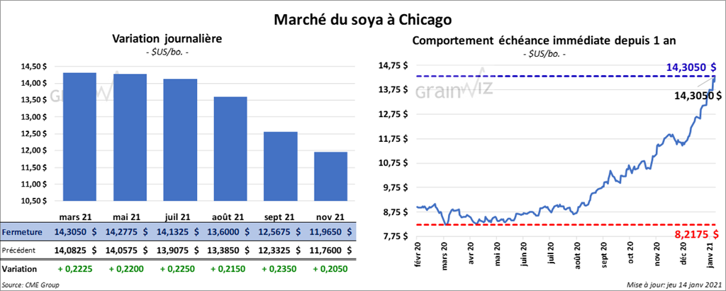 Les contrats de soya aux échéances les plus rapprochées ont fini la journée en hausse entre 21 ½ et 22 ½ cents. Ceux de tourteau de soya US aux échéances les plus rapprochées ont également clôturé avec des gains entre 5,70 $ et 7,80 $/tonnes. Les contrats d’huile de soya US aux échéances les plus rapprochées ont fermé en hausse de 67 à 93 points.