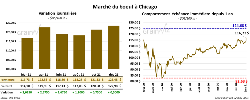 - Le 20 janvier dernier, le CME Feeder Cattle Index était en hausse de 38 cents à 133,19 $.