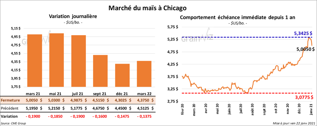 Les contrats de maïs US aux échéances les plus rapprochées ont terminé la journée en baisse entre 16 et 19 cents.