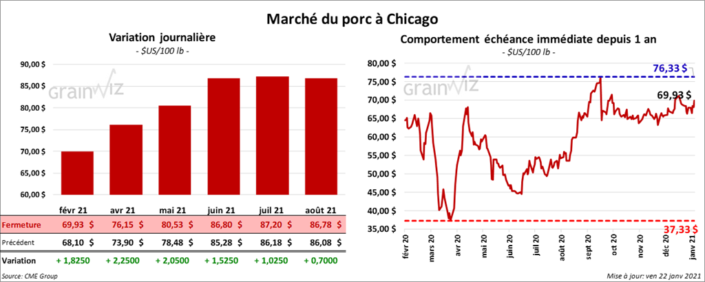 - Le 19 janvier dernier, le CME Lean Hog Index était en baisse de 25 cents à 65,67 $.