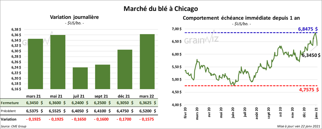 À Chicago, les contrats de blé aux échéances les plus rapprochées ont terminé la journée en baisse entre 16 et 19 ¼ cents. À Kansas, ceux de blé dur rouge aux échéances les plus rapprochées ont clôturé avec des pertes entre 21 ½ et 22 ½ cents. À Minneapolis, les contrats de blé de printemps aux échéances les plus rapprochées ont fermé en baisse entre 21 et 22 ¾ cents.