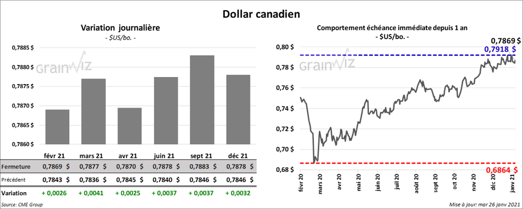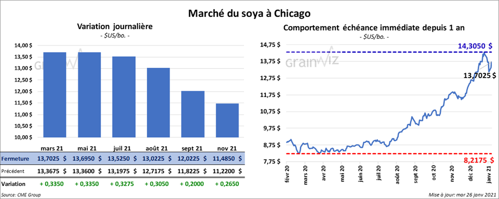 Les contrats de soya US aux échéances les plus rapprochées ont fermé en hausse entre 30 ½ et 33 ½ cents. Ceux de tourteau de soya US aux échéances les plus rapprochées ont également clôturé dans le vert entre 6,90 et 7,40 $/tonne. Les contrats d’huile de soya US aux échéances les plus rapprochées ont terminé la session avec des gains entre 73 et 97 points.